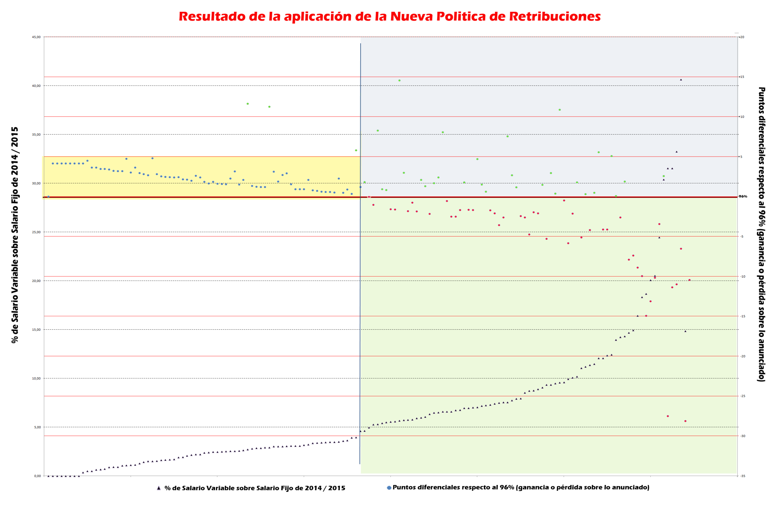 La realidad es que el nuevo sistema no tiene impacto en el 49% de los empleados. El motivo es que a todos los empleados que tenían un Bonus inferior al 4,2% de su salario fijo de 2014, matemáticamente, la Empresa no podía aplicar la regla del 96/4% porque el resultado era inferior al salario fijo real de 2015 y eso no es legal en España, menos mal. Aún así, a un 4% de ese grupo de empleados el Banco les ha aplicado un incremento real por encima del 96%.