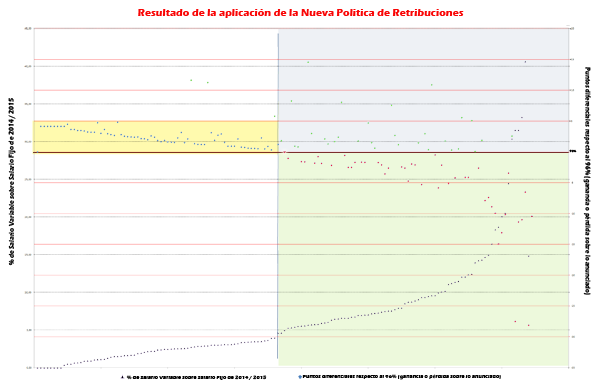 Pulsar aquí para la versión imprimibleOs adjuntamos un gráfico en la que podéis ver claramente el resultado de la muestra. Para entenderla mejor tened en cuenta lo siguiente:- La escala de la izquierda se corresponde con el porcentaje de bonus sobre salario fijo y cada registro está representado por un triángulo negro.