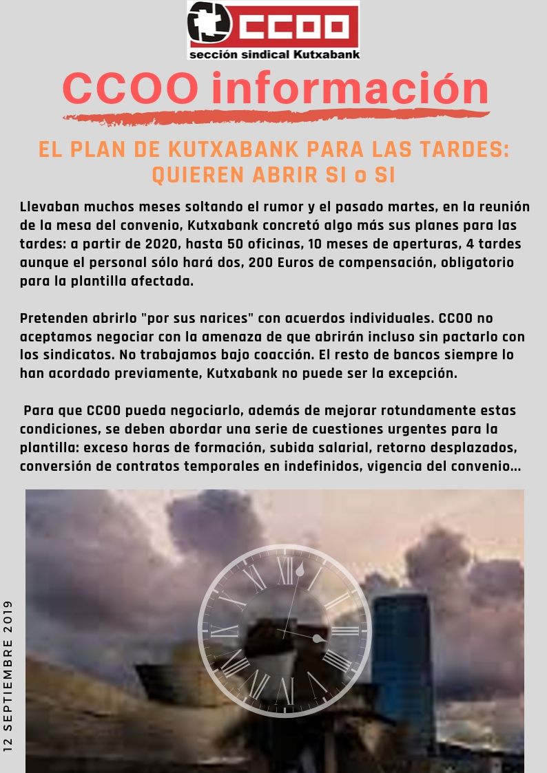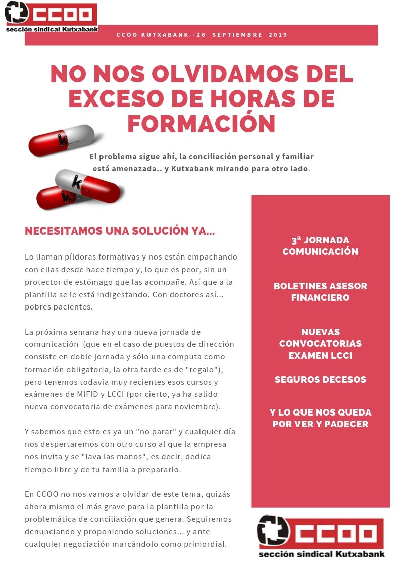 Más horas de formación; el gran problema de la plantilla lejos de solucionarse continúa suponiendo la gran amenaza para la conciliación personal y familiar exigiendo un gran esfuerzo.Sin duda una cuestión que debe solucionarse ya porque sigue causando graves quebraderos de cabeza a las personas que trabajamos en Kutxabank.