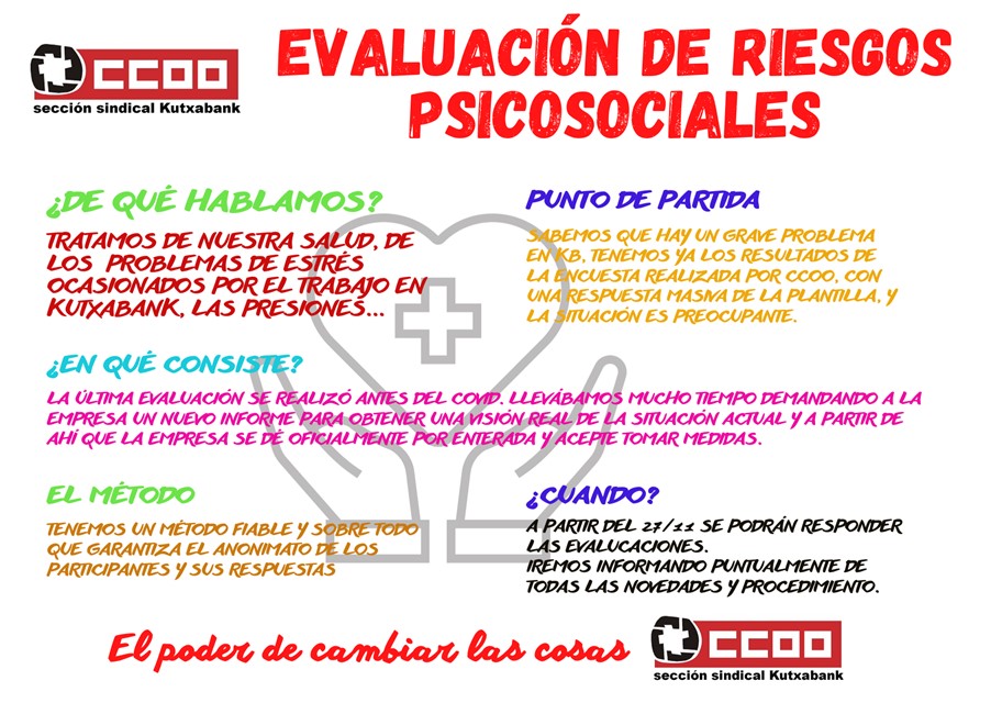 A finales de noviembre se realizará una nueva evaluación de riesgos psicosociales. Una gran oportunidad para reflejar las problemáticas que afectan en el día a día de las personas que trabajan en Kutxabank.