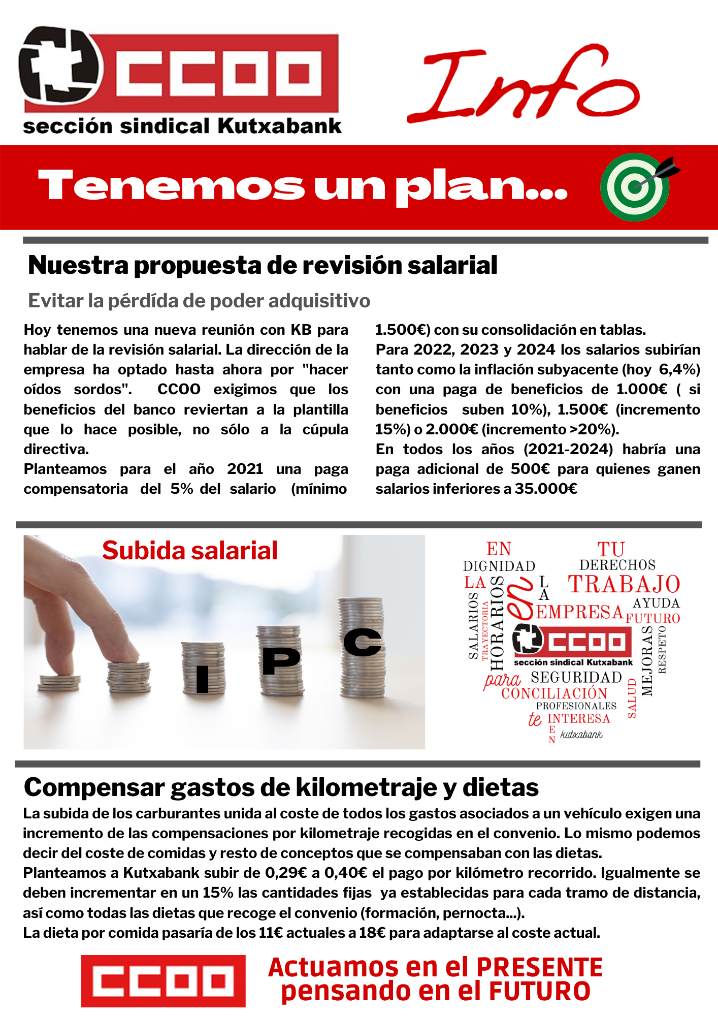 Presentamos nuestra propuesta de revisión salarial para evitar la pérdida de poder adquisitivo de la plantilla de Kutxabank. Seguimos esperando una contestación seria y responsable por parte de la dirección de la empresa. Se suceden las reuniones pero sin avances empresariales.