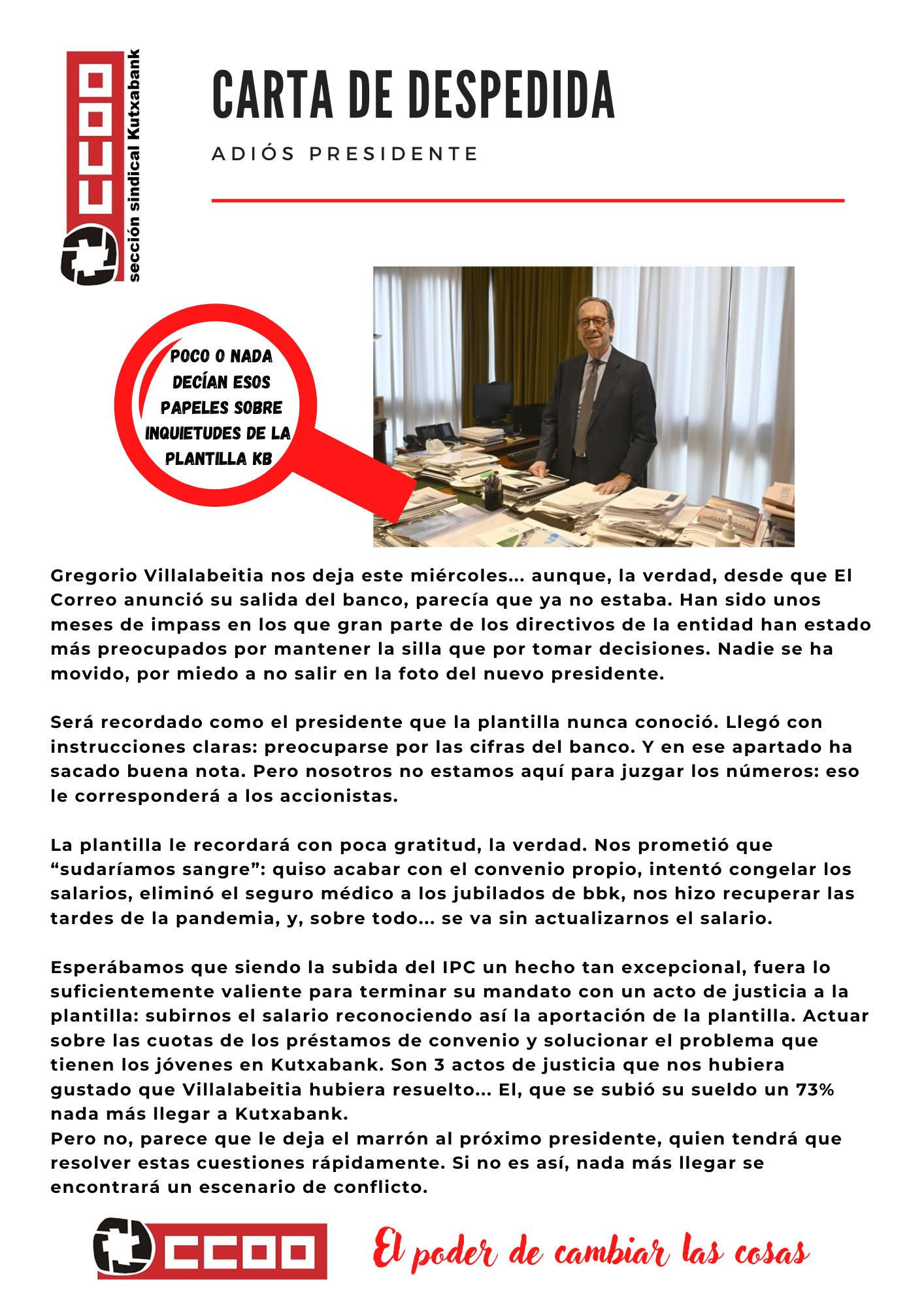 No podemos mostrar gratitud ante un presidente de Kutxabank al que casi ni conocimos ni mostró mayor interés por los problemas reales de la plantilla.