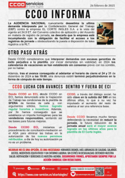 CCOO hacen una valoración de la reciente sentencia de la Audiencia Nacional por la que desestima la demanda interpuesta por el sindicato de la Confederación General del Trabajo (CGT) en la que se descarta que la empresa El Corte Inglés, S.A. esté incumpliendo con la obligación de facilitar el acceso a los registros de jornada u obstaculizando la puesta a disposición de tales registros a la representación legal de las personas trabajadoras (RLT).
