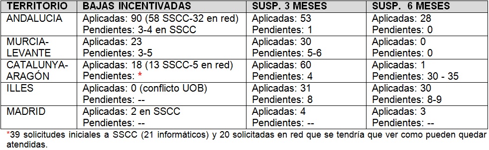 A la pregunta de qué criterios han utilizado en las suspensiones de 3 meses, nos contestan que estos criterios residen en la carga de trabajo de las plantillas de la red de oficinas, y que se continuará distribuyendo estas suspensiones a razón de 2/3 personas por zona. La elección la hacen trimestralmente los Jefes de Zona y Territoriales, con la supervisión del responsable de RRLL de cada territorio.