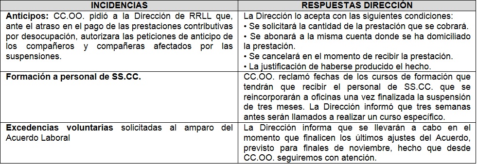 En esta reunión también se abordaron algunas de las incidencias que nos preocupa a CC.OO., y que han sido objeto de reiteradas reclamaciones en las últimas semanas. Aquí os hacemos mención de algunas de ellas: