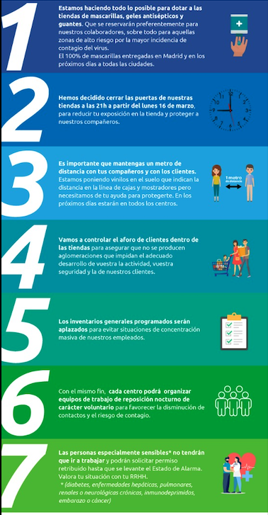 8-Organización de horarios. La Dirección recuerda que entre las medidas de seguridad adoptadas se ha ampliado el colectivo de trabajadores especialmente sensibles y que siempre se respeta la jornada máxima diaria establecida en el estatuto de los Trabajadores y en el Convenio Colectivo. Asimismo, informa que se están estudiando medidas para adaptarnos a la situación actual de cierre de secciones y a la venta actual.