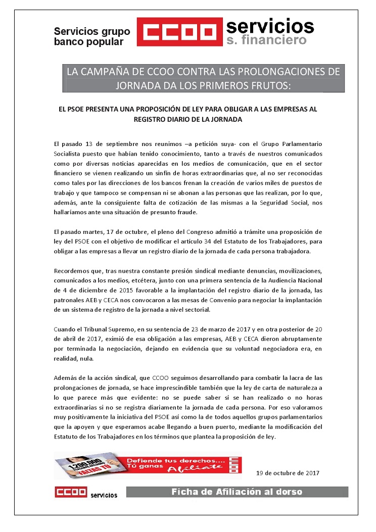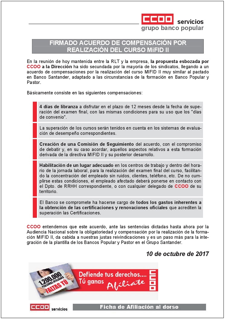 En la reunión de hoy mantenida entre la RLT y la empresa, la propuesta esbozada por CCOO a la Dirección ha sido secundada por la mayoría de los sindicatos, llegando a un acuerdo de compensaciones por la realización del curso MIFID II muy similar al pactado en Banco Santander, adaptado a las circunstancias de la formación en Banco Popular y Pastor.