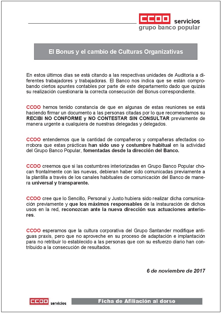 En estos últimos días se está citando a las respectivas unidades de Auditoría a di-ferentes trabajadores y trabajadoras. El Banco nos indica que se están compro-bando ciertos apuntes contables por parte de este departamento dado que quizás su realización cuestionaría la correcta consecución del Bonus correspondiente.