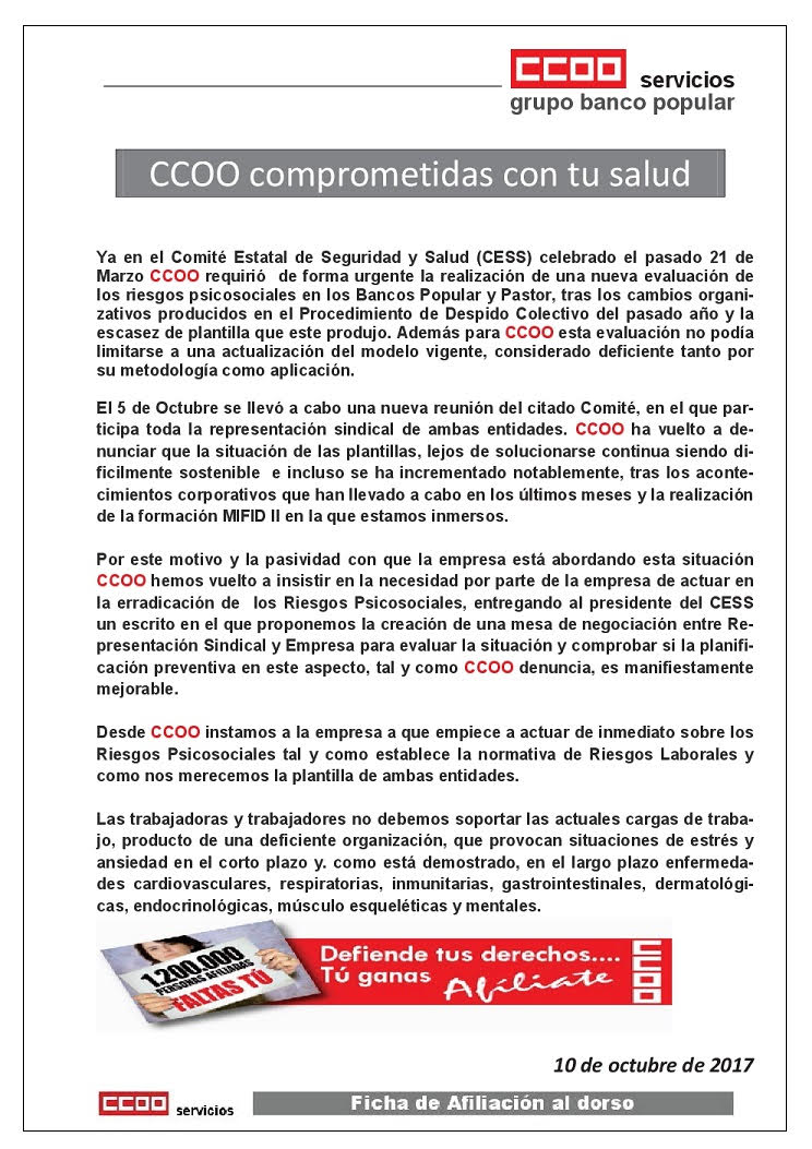 Ya en el Comité Estatal de Seguridad y Salud (CESS) celebrado el pasado 21 de Marzo CCOO requirió de forma urgente la realización de una nueva evaluación de los riesgos psicosociales en los Bancos Popular y Pastor, tras los cambios organizativos producidos en el Procedimiento de Despido Colectivo del pasado año y la escasez de plantilla que este produjo. Además para CCOO esta evaluación no podía limitarse a una actualización del modelo vigente, considerado deficiente tanto por su metodología como aplicación.