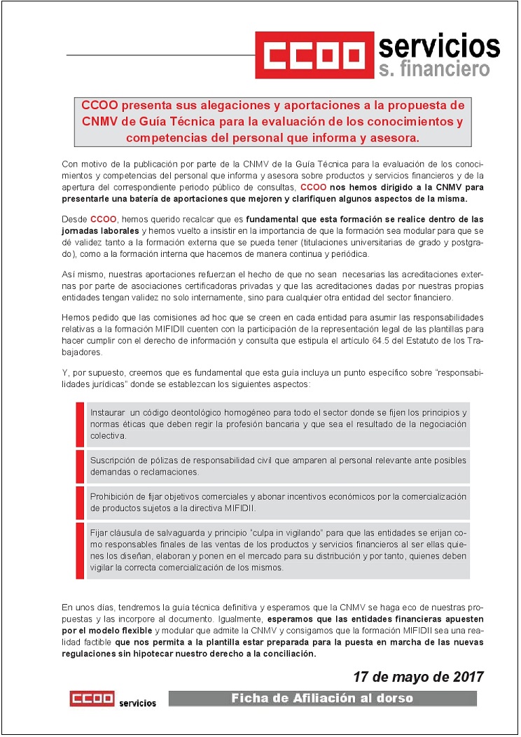 CCOO presenta alegaciones y aportaciones a CNMV sobre Mifid II