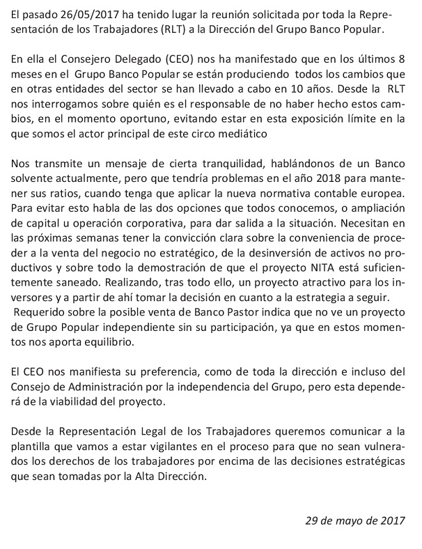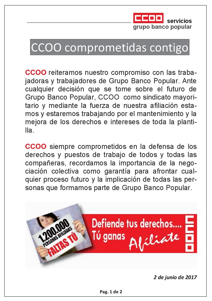 Tras el anuncio esta misma mañana de la adquisición de Banco Popular por Banco Santander, las secciones sindicales de CCOO en Banco Santander y Banco Popular valoramos positivamente esta solución, que pone fin al entorno de incertidumbre que afectaba a clientes y mercados, y esperamos que además sea la mejor opción para sus trabajadores y trabajadoras.