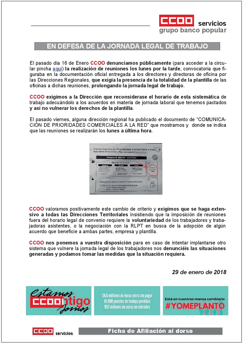 El pasado día 16 de Enero CCOO denunciamos públicamente la realización de reuniones los lunes por la tarde, convocatoria que figuraba en la documentación oficial entregada a los directores y directoras de oficina por las Direcciones Regionales, que exigía la presencia de la totalidad de la plantilla de las oficinas a dichas reuniones, prolongando la jornada legal de trabajo.
