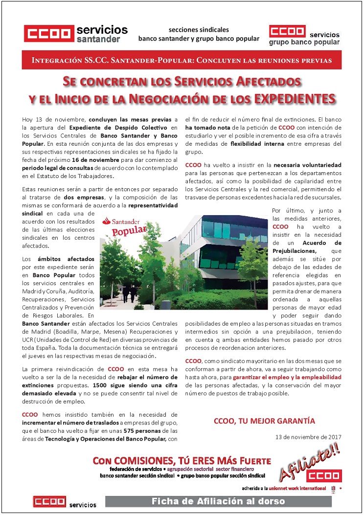 Hoy 13 de noviembre, concluyen las mesas previas a la apertura del Expediente de Despido Colectivo en los Servicios Centrales de Banco Santander y Banco Popular. En esta reunión conjunta de las dos empresas y sus respectivas representaciones sindicales se ha fijado la fecha del próximo 16 de noviembre para dar comienzo al periodo legal de consultas de acuerdo con lo contemplado en el Estatuto de los Trabajadores.