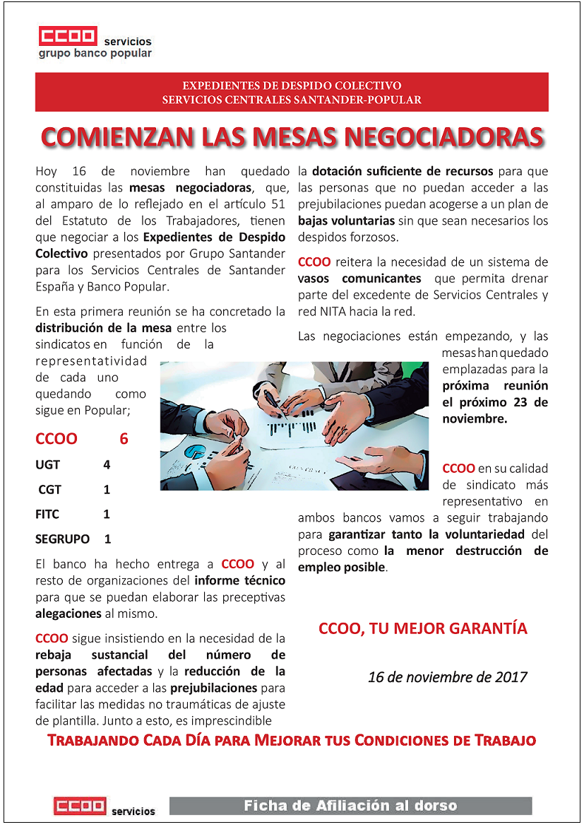 Hoy 16 de noviembre se han constituido las mesas negociadoras que al amparo de lo reflejado en el artículo 51 del Estatuto de los Trabajadores, tienen que negociar a los Expedientes de Despido Colectivo presentados por Grupo Santander para los Servicios Centrales de Santander España y Banco Popular.