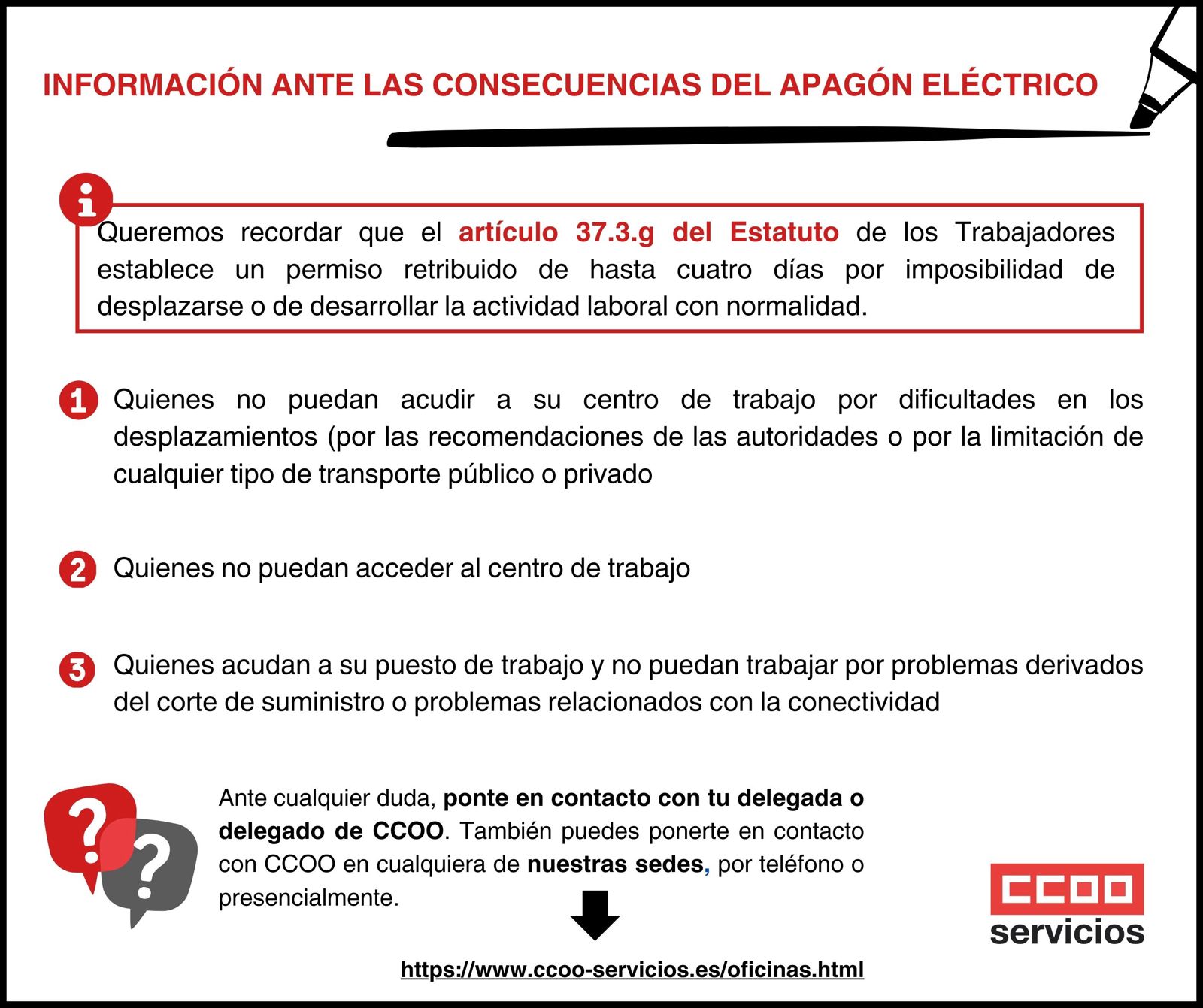 Con motivo del apagón eléctrico general que ha afectado el conjunto de la Península Ibérica el 28 de abril de 2025, CCOO pone a disposición de los trabajadores y las trabajadoras, y de la opinión pública general, la siguiente información recopilada por sus servicios jurídicos y de asesoramiento: