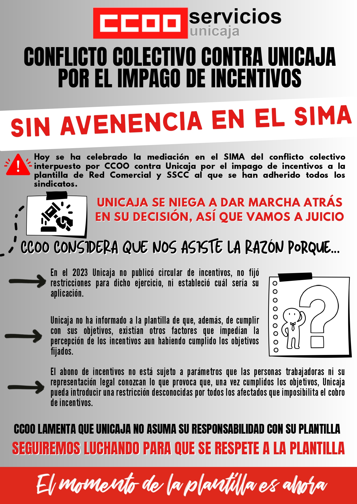 Hoy se ha celebrado la mediación en el SIMA del conflicto colectivo interpuesto por CCOO contra Unicaja por el impago de incentivos a la plantilla de Red Comercial y SSCC