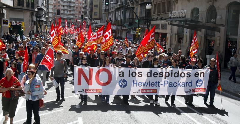 Trabajadores de HP se agrupaban este 1º de Mayo tras una pancarta bajo el lema “NO a los despidos en Hewlett-Packard”. La manifestación que trascurrió desde la Plaza de San Miguel hasta la Plaza Paraíso de Zaragoza es el inicio de un calendario de paros y movilizaciones que se desarrollará durante los treinta días de negociaciones del ERE.Mañana viernes a las 10 tendrá lugar en el Servicio Aragonés de Mediación y Arbitraje el acto de conciliación previo al inicio de los paros, que están legalmente convocados para que se desarrollen a partir del lunes 5.Para Rubén García, presidente del Comité de Empresa de HP Outsourcing, “los 205 despidos anunciados son todo un mazazo, por lo que la huelga es obligada. Será la propia plantilla y el discurrir de las negociaciones lo que marcarán la frecuencia de los paros y de las movilizaciones”.Esta no será la primera huelga en Hewlett-Packard. Durante la primera semana de junio del año pasado los trabajadores de la multinacional pararon en todo el país ante las medidas de recortes salariales planteadas por la dirección. En aquella huelga el seguimiento en el centro de trabajo de Zaragoza fue total y las medidas planteadas por la empresa fueron retiradas en su práctica totalidad.