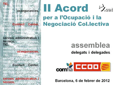 Durante el pasado lunes 6 de Febrero, en l Sala de Actos de CCOO de Catalunya se desarrolló una asamblea de delegados y delegadas de COMFIA de los sectores de Seguros, Contact Center, TIC y Servicios Técnicos y administrativos con el fin de presentar y debatir sobre el II acuerdo de Empleo y Negociación Colectiva, firmado el pasado 25 de enero por CCOO, UGT, CEOE Y CEPYME. Desde la firma del Acuerdo también se ha presentado y debatido en cuatro plenarios realizados en el sector de banca, está previsto realizar reuniones próximamente en el sector de ahorro y territorios.