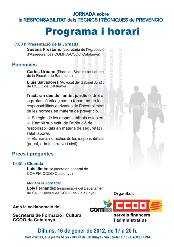 La Federación de Servicios Financieros y Administrativos (COMFIA) de CCOO de Catalunya ha realizado el 30 de noviembre en Barcelona una Jornada Técnica sobre «Trabajo seguro: Trabajar sin miedo» con la asistencia de 50 delegados y delegadas de prevención, en la que se han analizado las situaciones de violencia extrema a las que están expuestas las plantillas en los diferentes sectores que representa COMFIA.