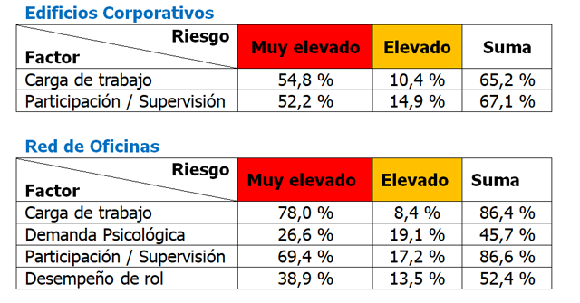 En este primer informe solo os queremos destacar los resultados globales, de los Edificios Corporativos y la Red de Oficinas, de los factores en los que la suma del porcentaje de riesgo muy elevado y de riesgo elevado superan el 40%.