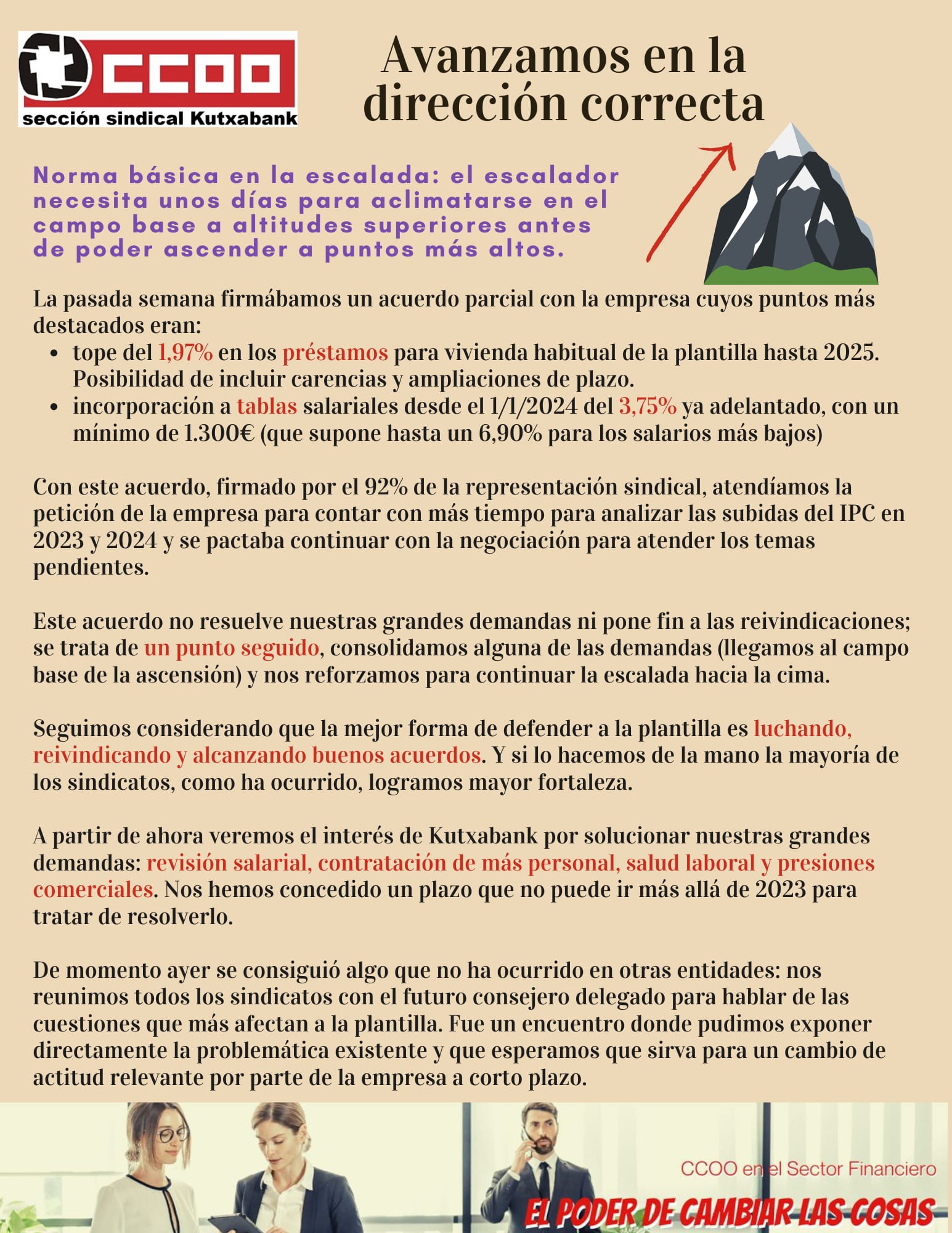 Hemos logrado firmar un acuerdo parcial donde se recogen aspectos relativos a la limitación del tipo de interés de los préstamos de vivienda habitual de la plantilla y la incorporación a tablas de la última subida salarial. Esto debe ser sólo el principio.