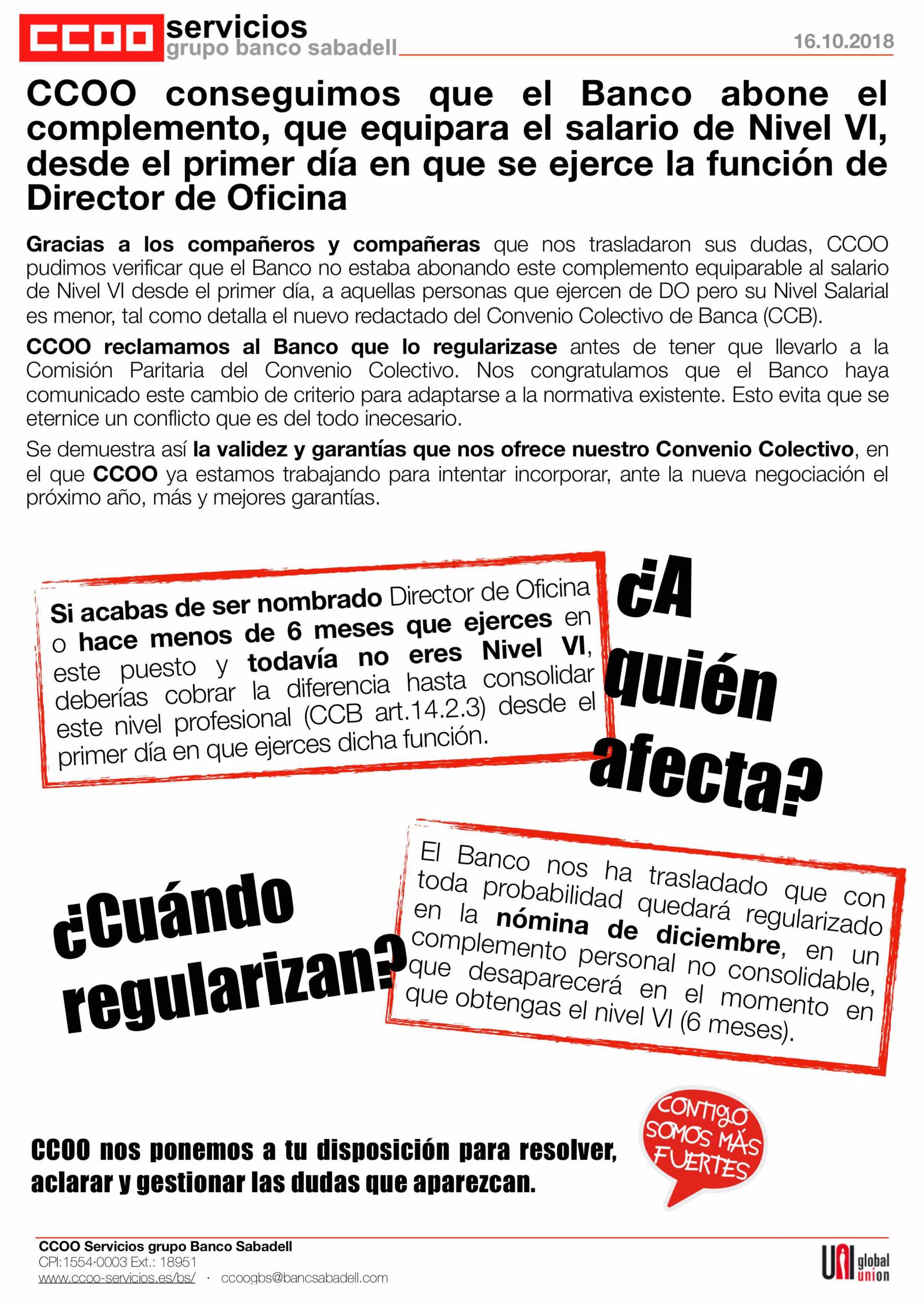 CCOO advertimos al Banco que estaba incumpliendo el Convenio Colectivo, y que debía abonar un complemento que equiparase el salario de un Director de Oficina hasta la consolidación de la función.