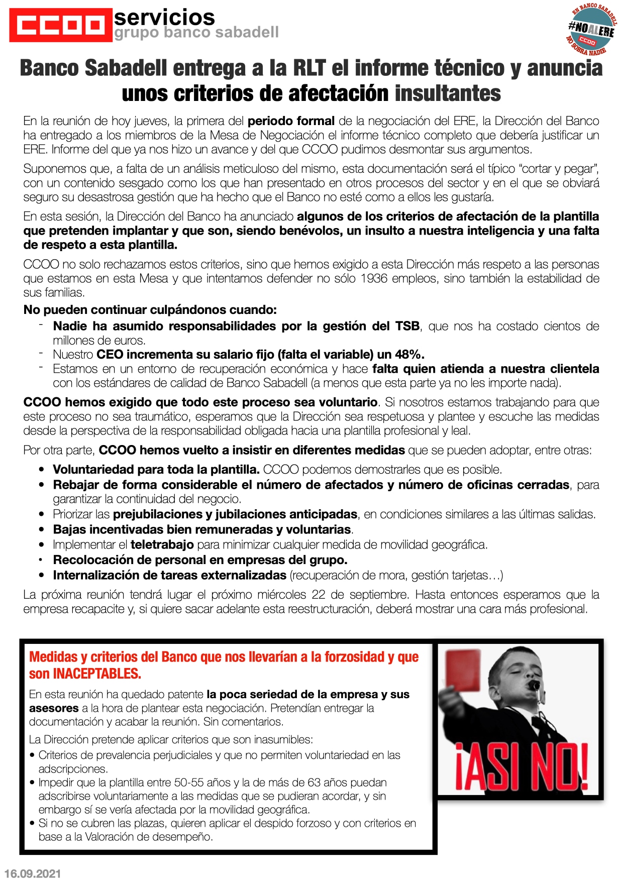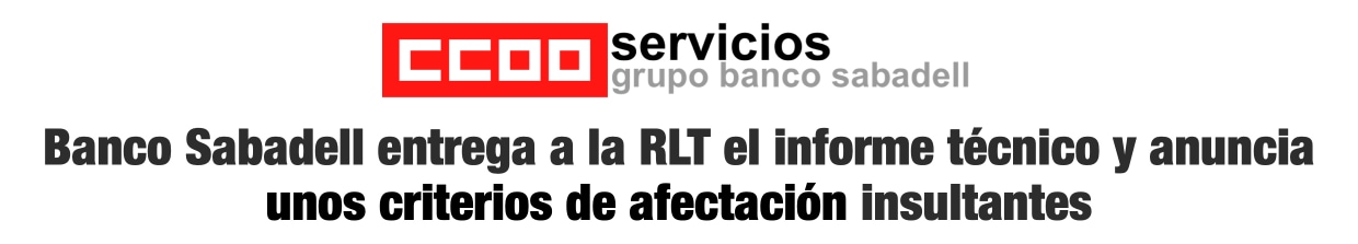 Banco Sabadell entrega a la RLT el informe técnico y anuncia unos criterios de afectación insultantes