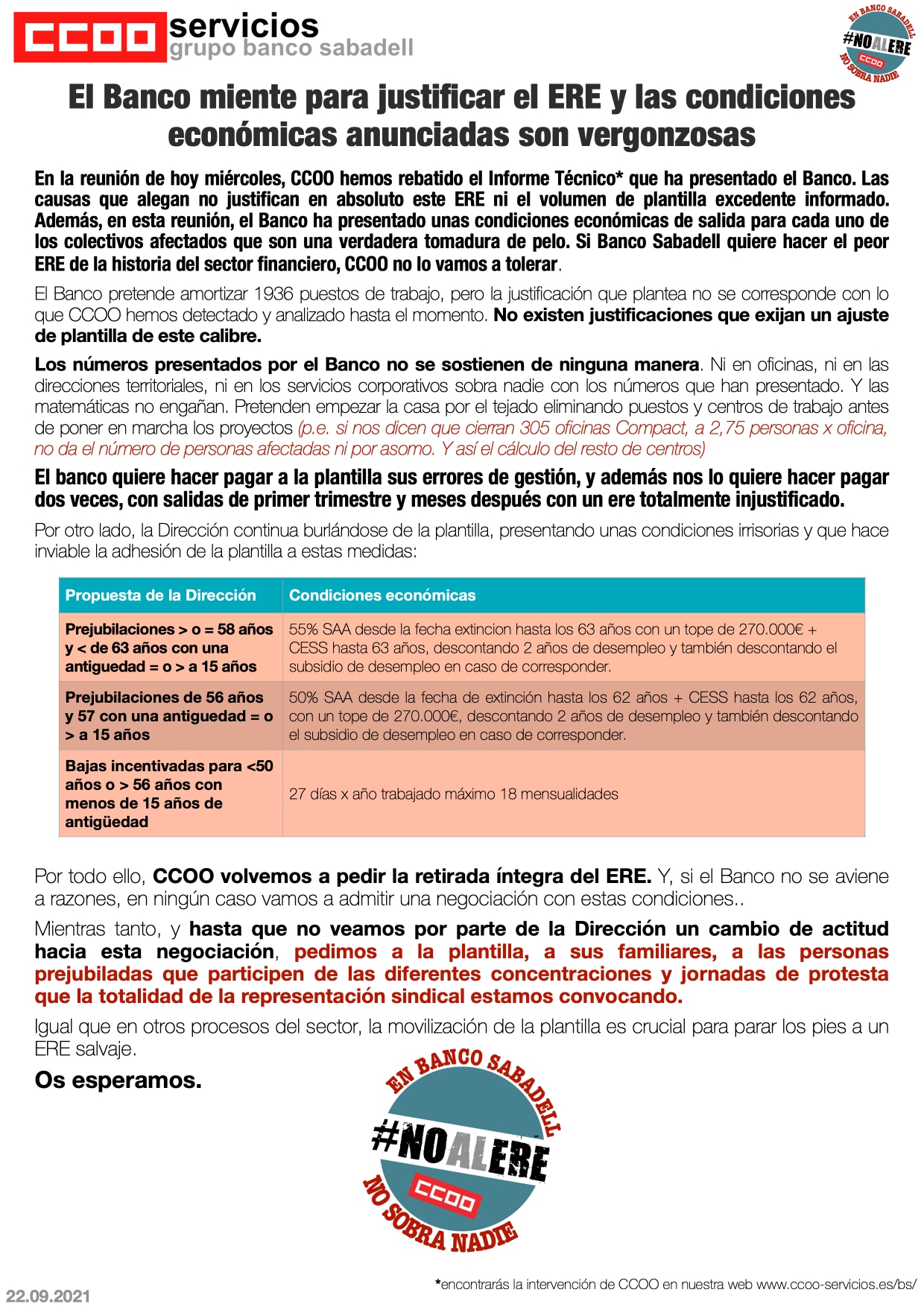 El Banco Sabadell miente para justificar el ERE y las condiciones económicas anunciadas son vergonzosas