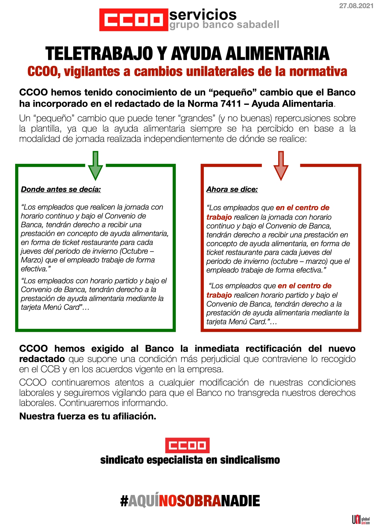 Banco Sabadell modifica unilateralmente la normativa de la ayuda alimentaria