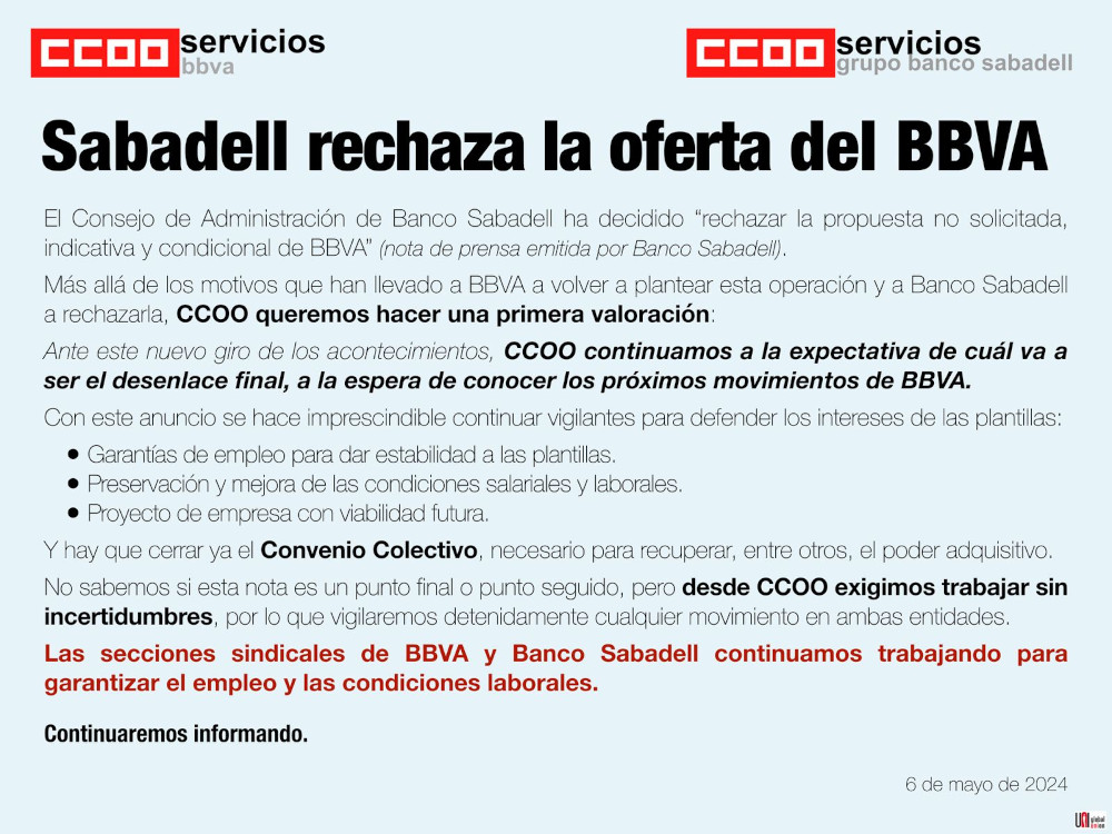 El Consejo de Administración de Banco Sabadell ha decidido “rechazar la propuesta no solicitada, indicativa y condicional de BBVA” (nota de prensa emitida por Banco Sabadell).