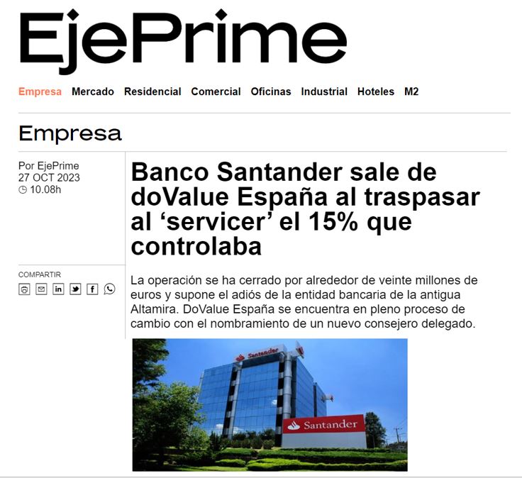 EjePrime – Banco Santander sale de doValue España al traspasar al "servicer" el 15% que controlaba