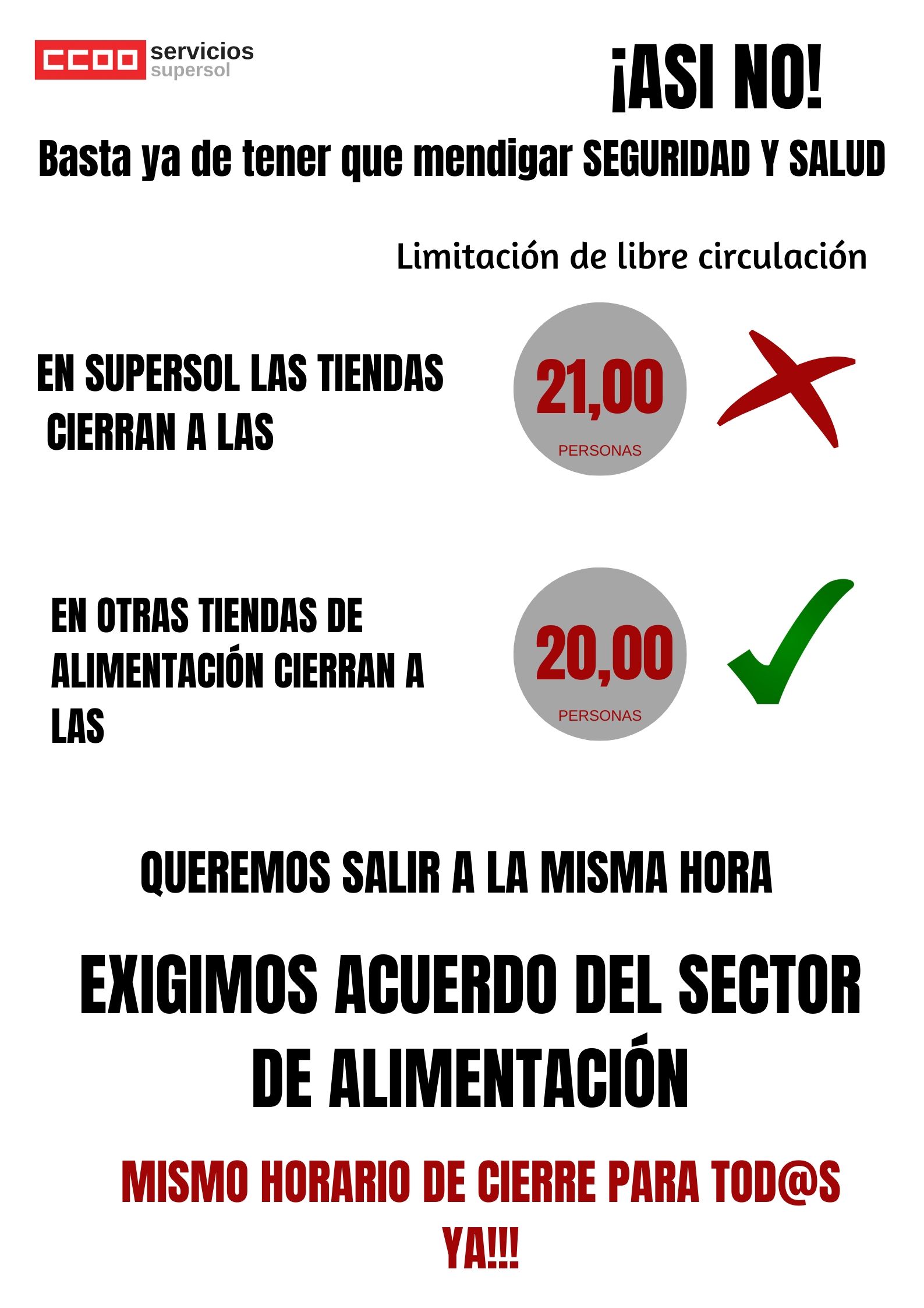 Damos un servicio esencial para abastecer a la población, así lo recoge el Real Decreto de estado de alarma. Y no nos merecemos este trato. ¿Por qué otras cadenas pueden cerrar a las 20.00 y Supersol a las 21.00? ¿Por qué en el mismo sector unos trabajadores están más expuestos que otros? A la emrpersa le decimos que no es momento de generar un conflicto con su plantilla, detrás de nuestras exigencias solo hay un objetivo proteger nuestra salud y nuestras vidas.