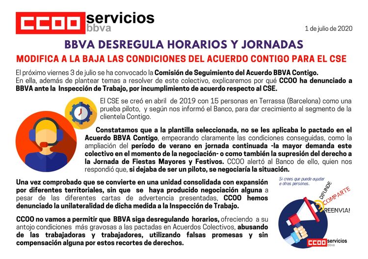El próximo viernes 3 de julio se ha convocado la Comisión de Seguimiento del Acuerdo BBVA Contigo. En ella, además de plantear temas a resolver de este colectivo, explicaremos por qué CCOO ha denunciado a BBVA ante la Inspección de Trabajo, por incumplimiento de acuerdo respecto al CSE.