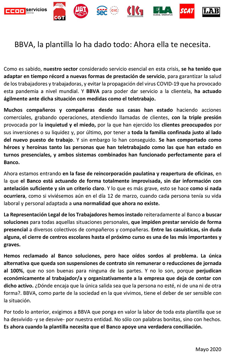 Como es sabido, nuestro sector considerado servicio esencial en esta crisis, se ha tenido que adaptar en tiempo récord a nuevas formas de prestación de servicio, para garantizar la salud de los trabajadores y trabajadoras, y evitar la propagación del virus COVID-19 que ha provocado esta pandemia a nivel mundial. Y BBVA para poder dar servicio a la clientela, ha actuado ágilmente ante dicha situación con medidas como el teletrabajo.