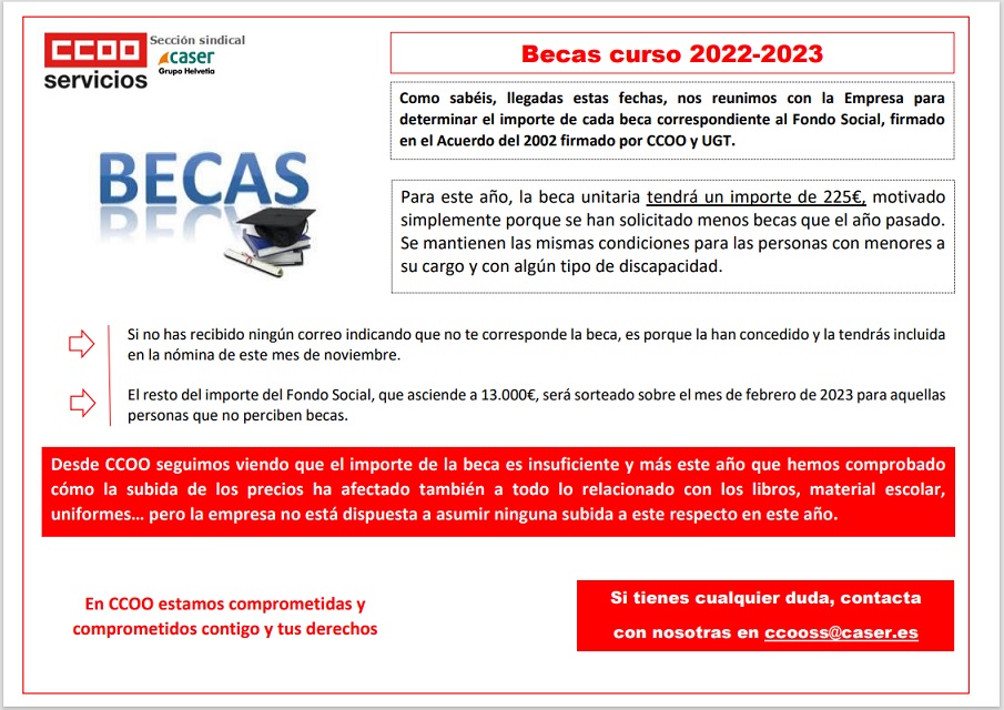 Como sabéis, llegadas estas fechas, nos reunimos con la Empresa para determinar el importe de cada beca correspondiente al Fondo Social, firmado en el Acuerdo del 2002 firmado por CCOO y UGT.