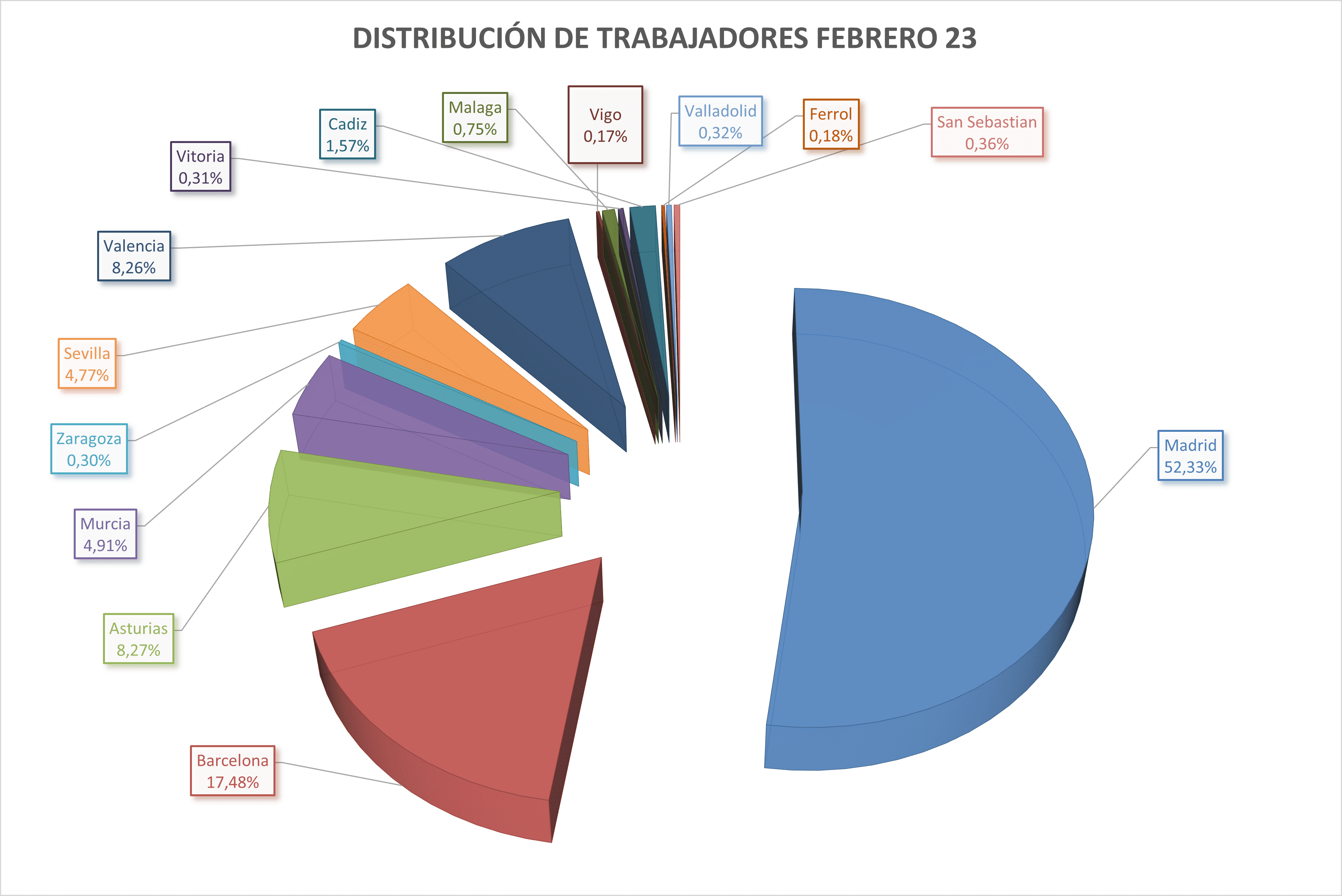 En cuanto al total nacional, Madrid continua teniendo el mayor número de trabajadores asignados, afianzándose en más del 50% del total de trabajadores , no registrándose variación reseñables. Recordar que en este gráfico también están contabilizados compañeros externos y becarios.