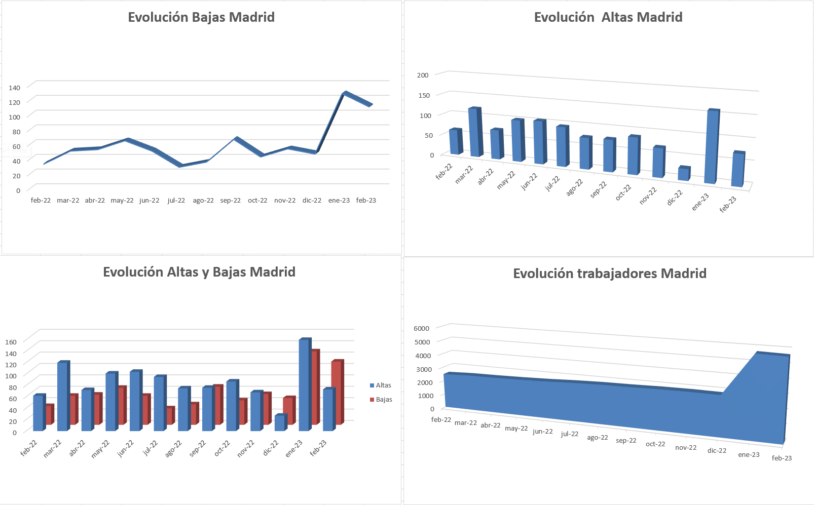Continuamos actualizando la información sobre la evolución de la plantilla en Madrid a partir de los datos de los que disponemos. Estos datos corresponden a febrero 2023 ya integrados los compañeros de Altran, preocupante el numero de bajas que aún mantenemos en febrero después de la integración de los compañeros de Altran. Las altas sin embargo, continúan con el patrón inicial que suele darse a principios de cada año