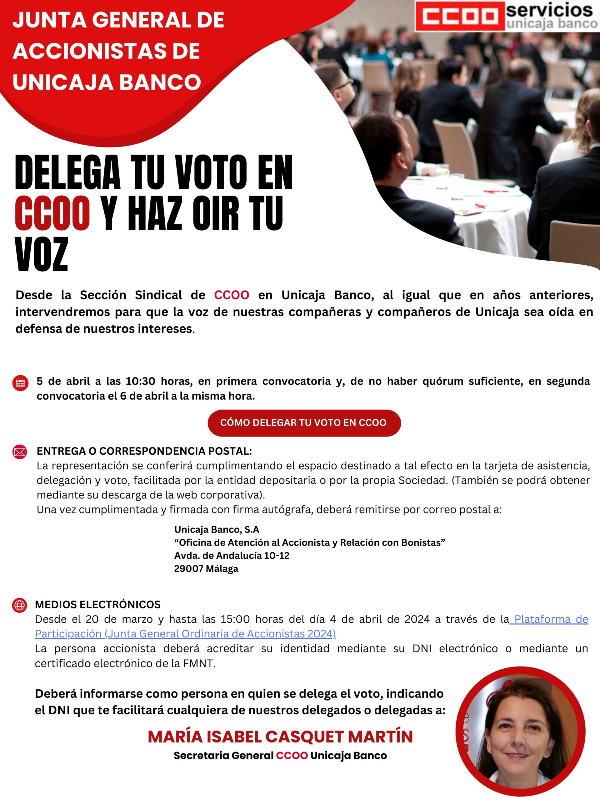 Al igual que en años anteriores, CCOO intervendrá en la JGA del próximo 5 de abril para que la voz de nuestras compañeras y compañeros sea oída en defensa de nuestros intereses.
