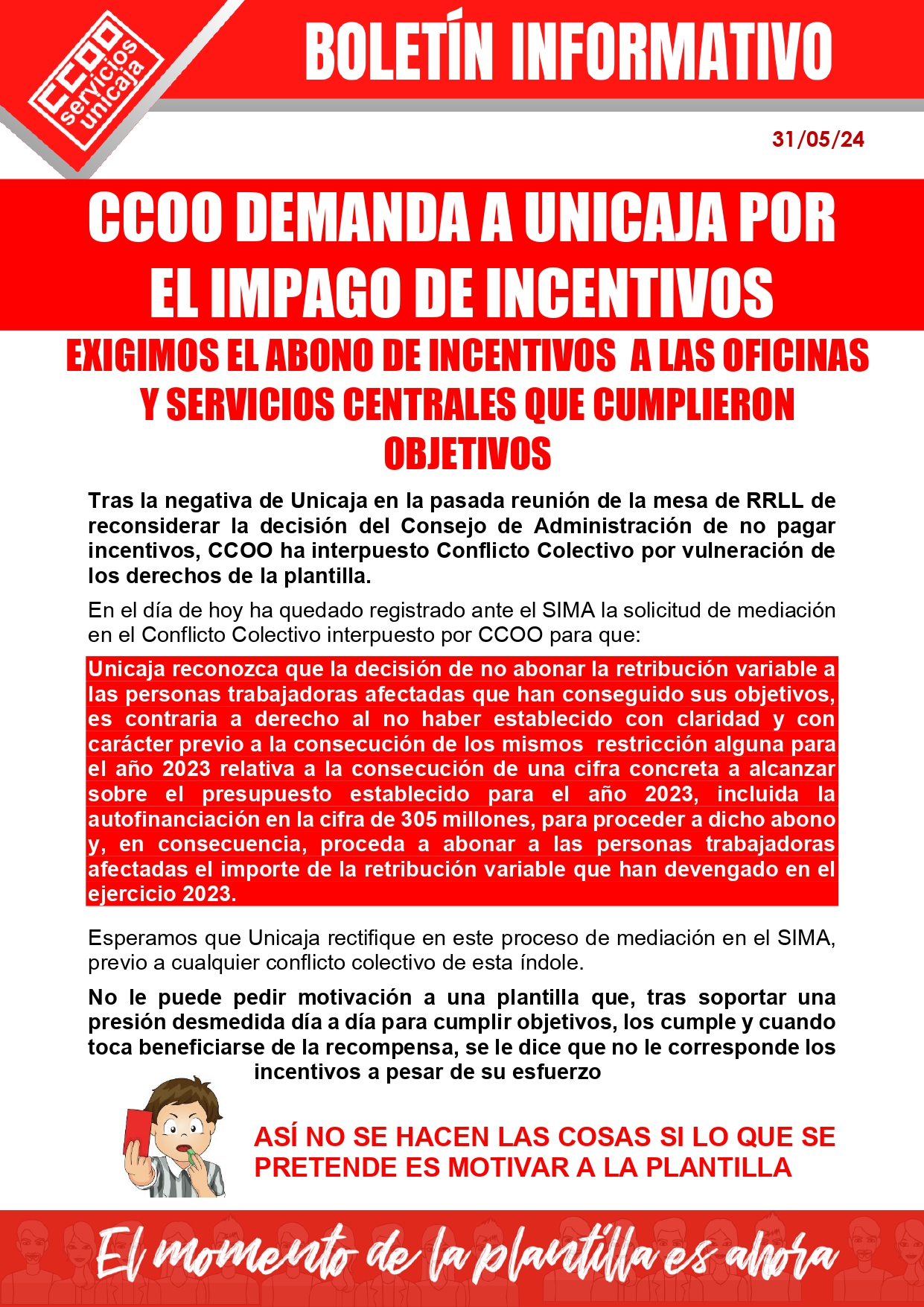 Tras la negativa de unicaja en la pasada reunión de la mesa de RR.LL de reconsiderar la decisión del Consejo de Administración de no pagar incentivos, CCOO ha interpuesto Conflicto Colectivo por vulneración de los derechos de la plantilla.