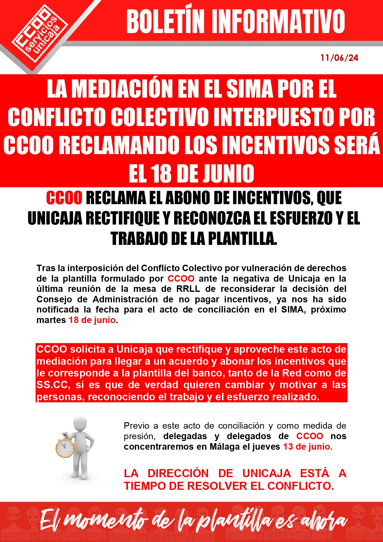 CCOO reclama el abono de incentivos, que Unicaja rectifique y reconozca el esfuerzo y el trabajo de la plantilla.