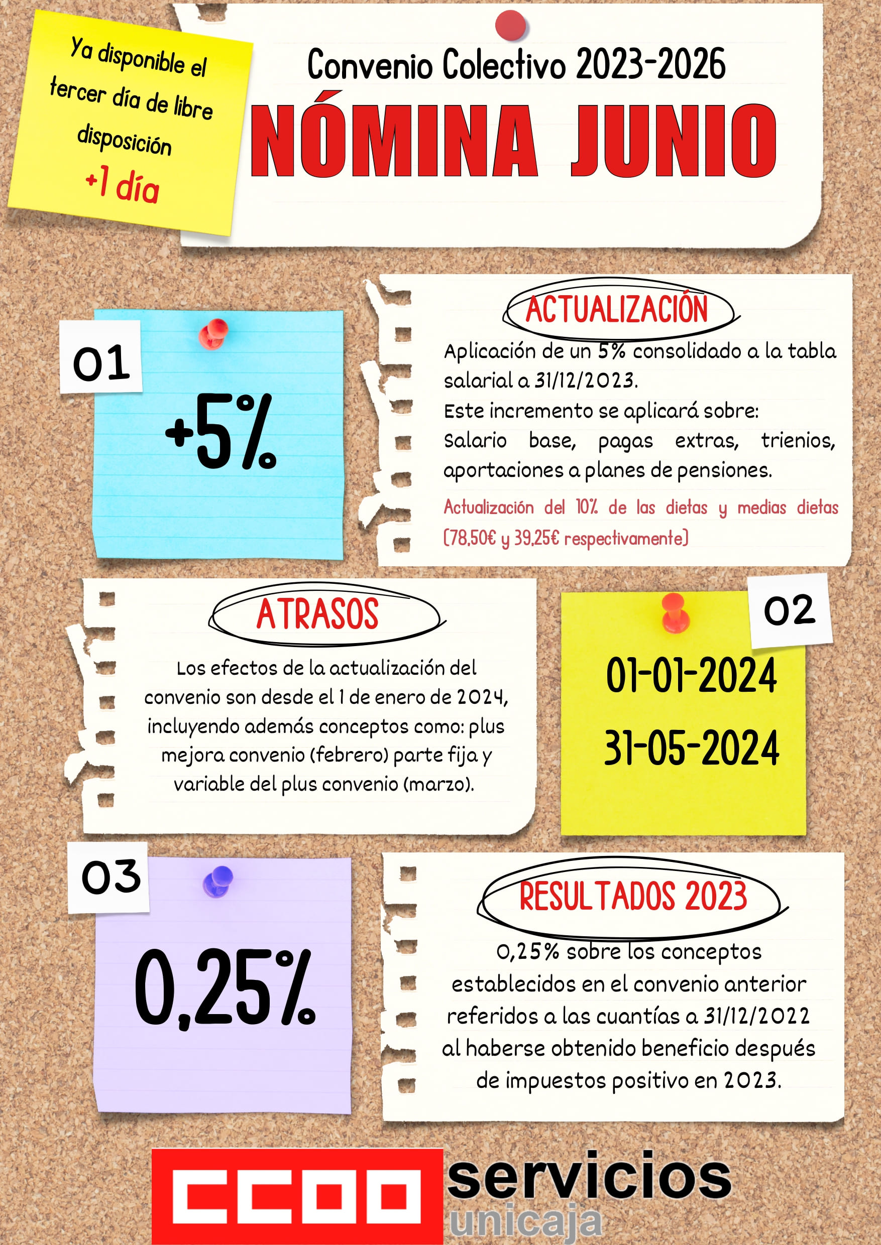 En CCOO hemos preparado una infografía con la que de un solo vistazo podrás ver todo lo que debe incluir tu nómina del mes de junio gracias al Convenio de Ahorro 2023-2026, publicado en el BOE el pasado día 6, por el que tanto han luchado este sindicato y las plantillas del sector secundando incluso una huelga.