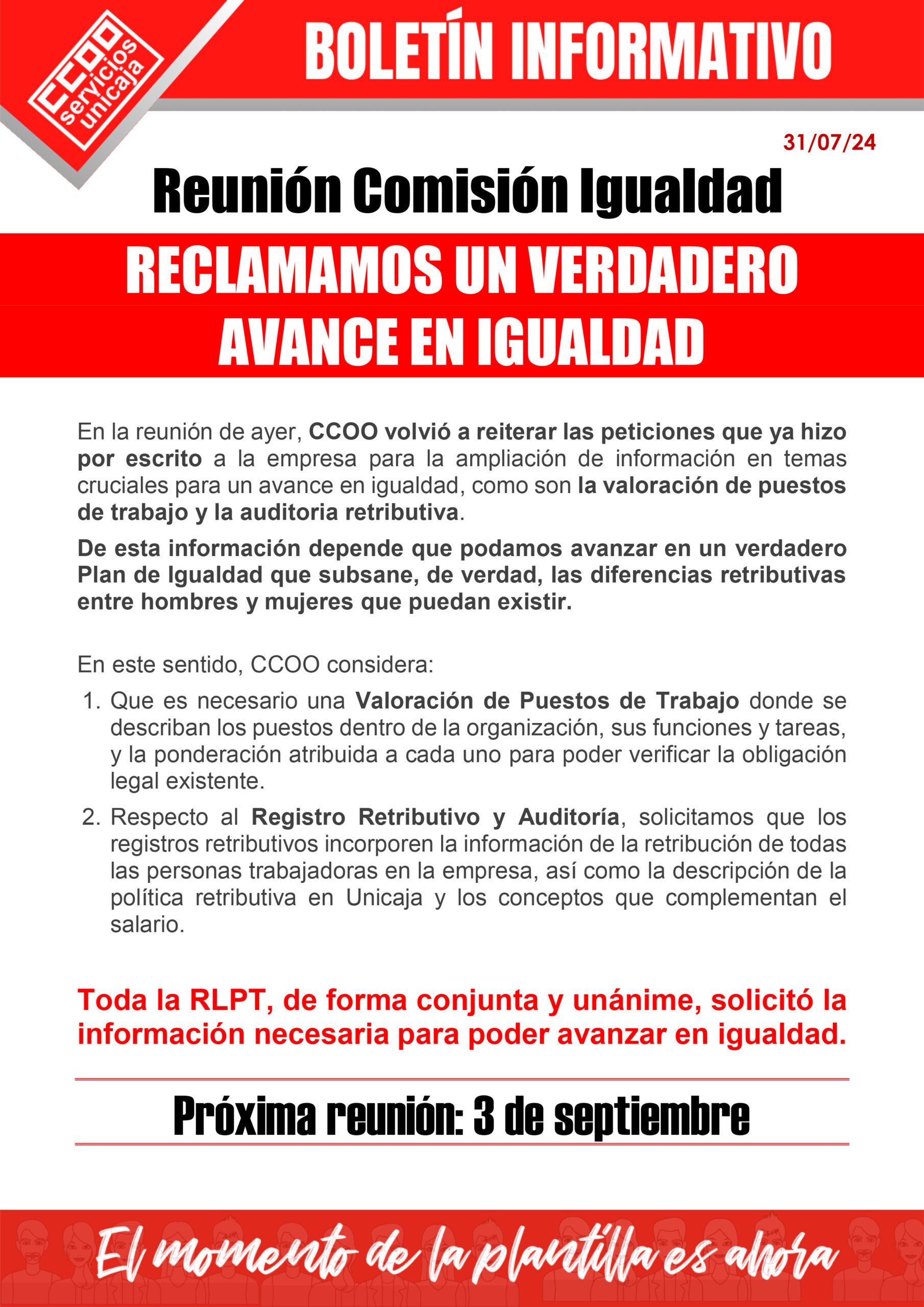 CCOO volvió a reiterar las peticiones que ya hizo por escrito a la empresa para la ampliación de información en temas cruciales para un avance en igualdad, como son la valoración de puestos de trabajo y la auditoría retributiva.