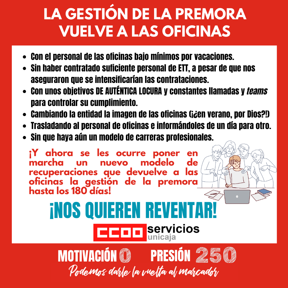 Verano, el personal de las oficinas bajo mínimos por vacaciones, sin haber contratado suficiente personal de ETT, a pesar de que nos aseguraron que se intensificarían las contrataciones, con objetivos DE AUTÉNTICA LOCURA y constantes llamadas y teams para controlar su cumplimiento, trasladando al personal de oficinas e informándoles de un día para otro, sin un modelo de carreras profesionales…