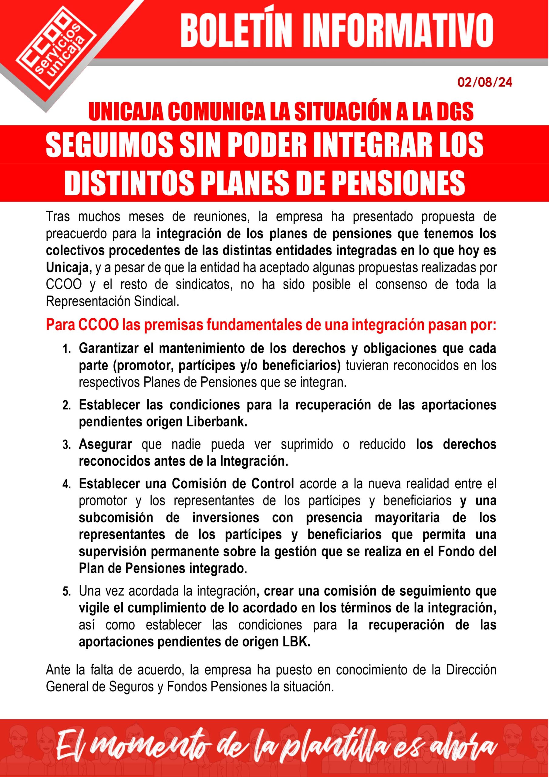 Tras muchos meses de reuniones, la empresa presentó una propuesta para la integración de los planes de pensiones de los colectivos procedentes de las distintas entidades, y a pesar de que esta aceptó algunas propuestas realizadas por CCOO y el resto de sindicatos, no ha sido posible el consenso de toda la Representación Sindical.