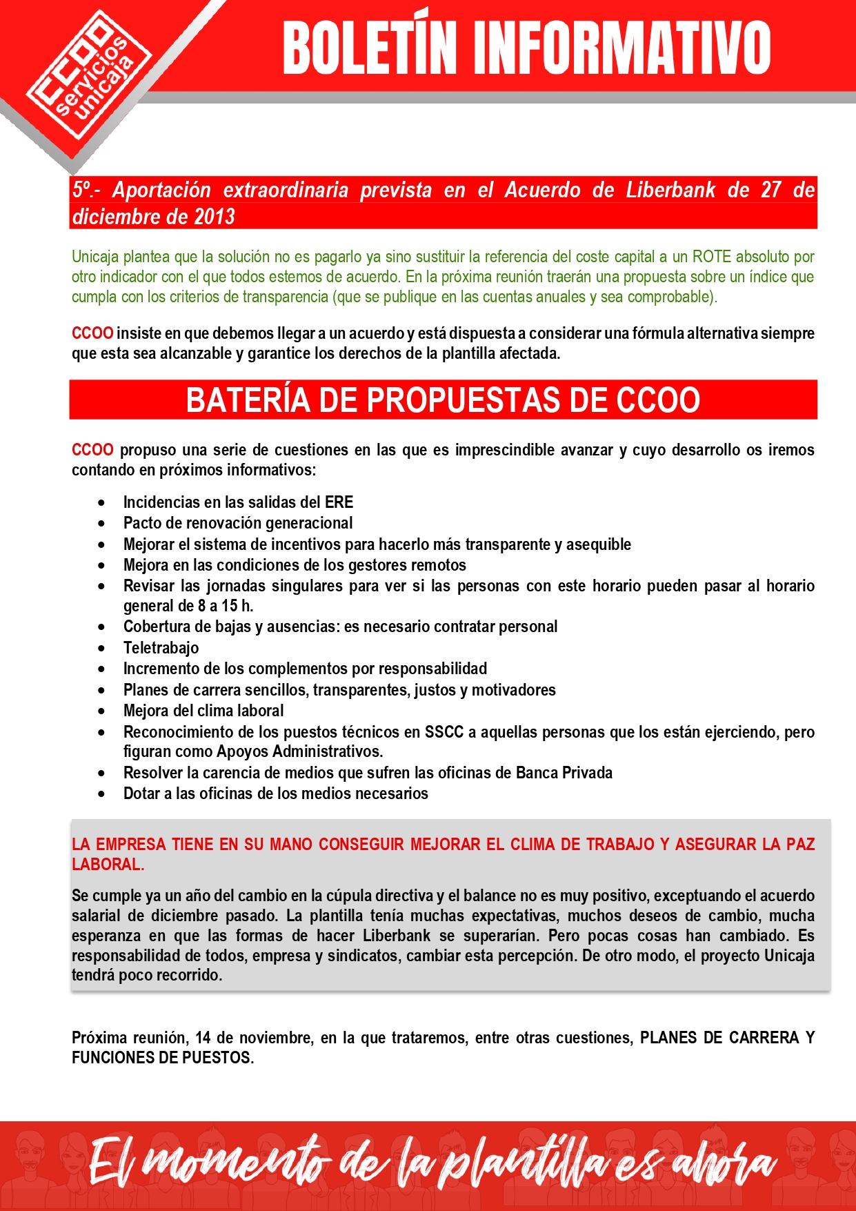 Se cumple ya un año del cambio en la cúpula directiva y el balance no es muy positivo, exceptuando el acuerdo salarial de diciembre pasado. La plantilla tenía muchas expectativas, muchos deseos de cambio, mucha esperanza en que las formas de hacer Liberbank se superarían. Pero pocas cosas han cambiado. Es responsabilidad de todos, empresa y sindicatos, cambiar esta percepción. De otro modo, el proyecto Unicaja tendrá poco recorrido.