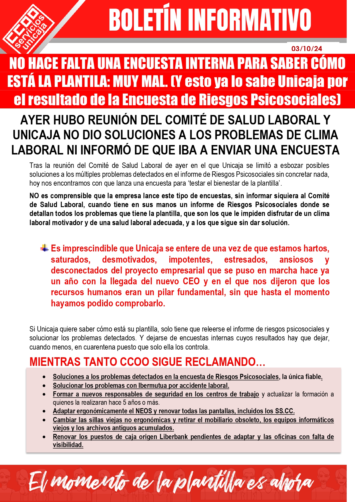 AYER HUBO REUNIÓN DEL COMITÉ DE SALUD LABORAL Y UNICAJA NO DIO SOLUCIONES A LOS PROBLEMAS DE CLIMA LABORAL NI INFORMÓ DE QUE IBA A ENVIAR UNA ENCUESTA