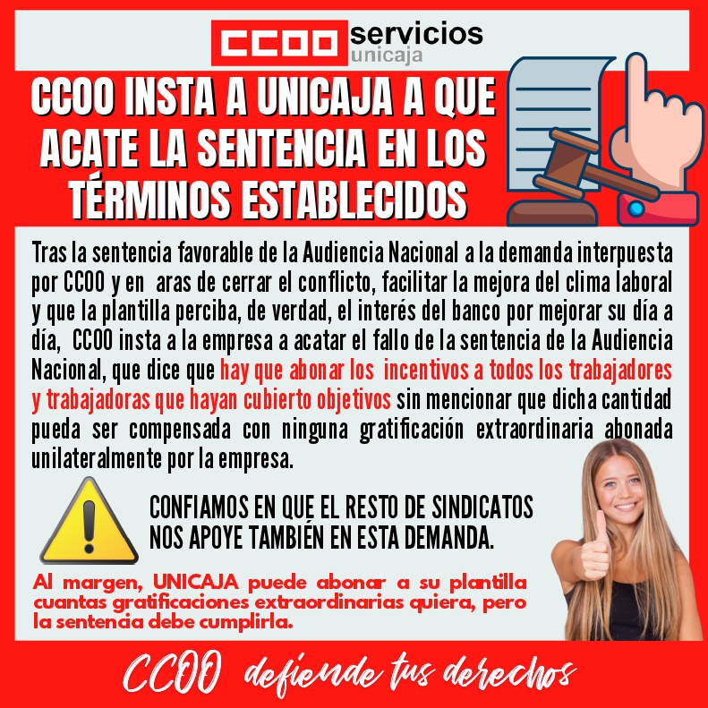 CCOO INSTA A UNICAJA A QUE ACATE LA SENTENCIA EN LOS TÉRMINOS ESTABLECIDOS