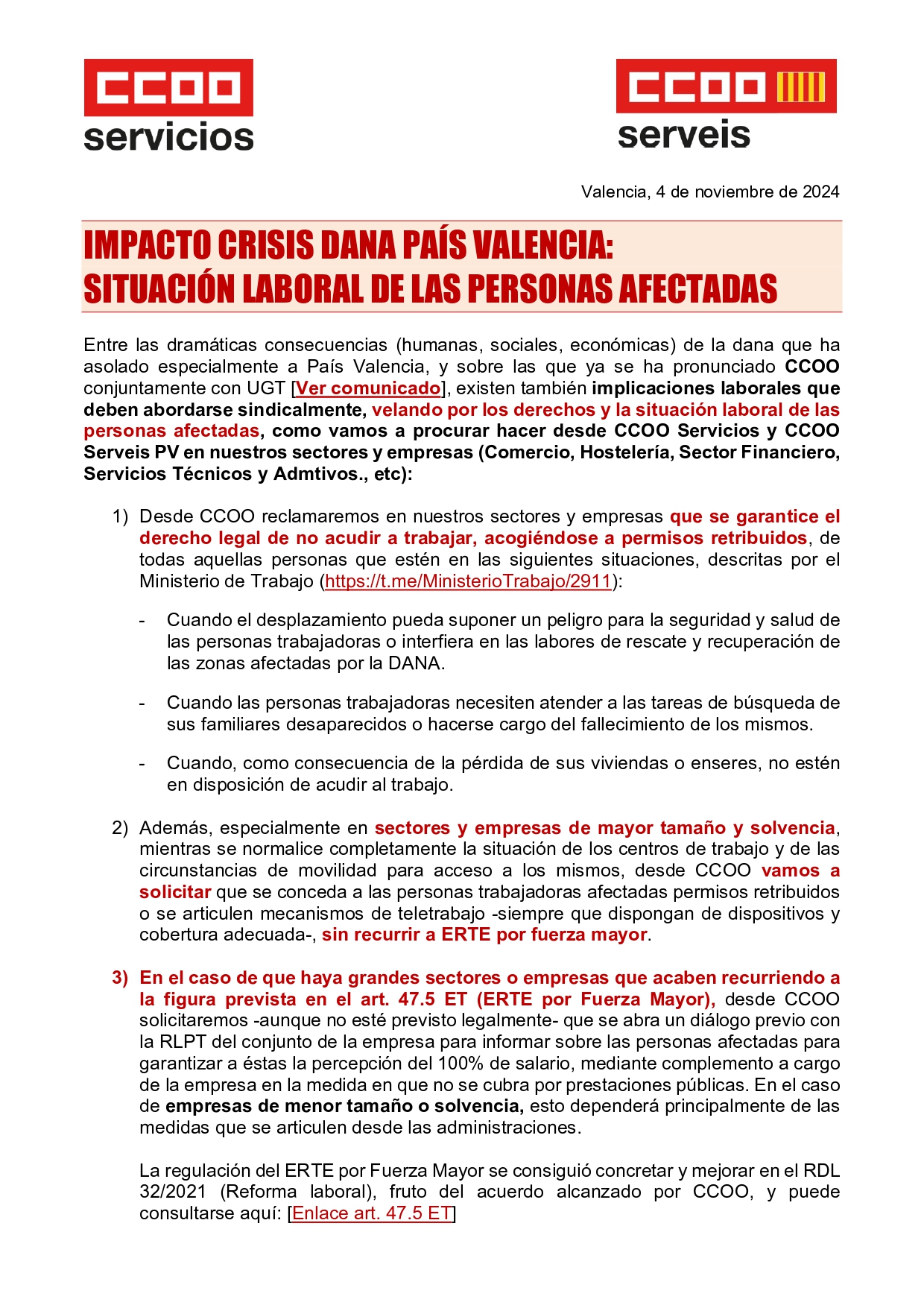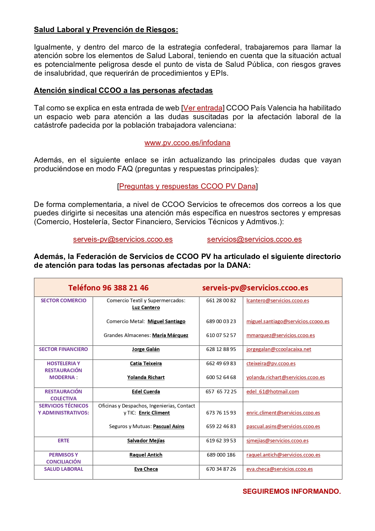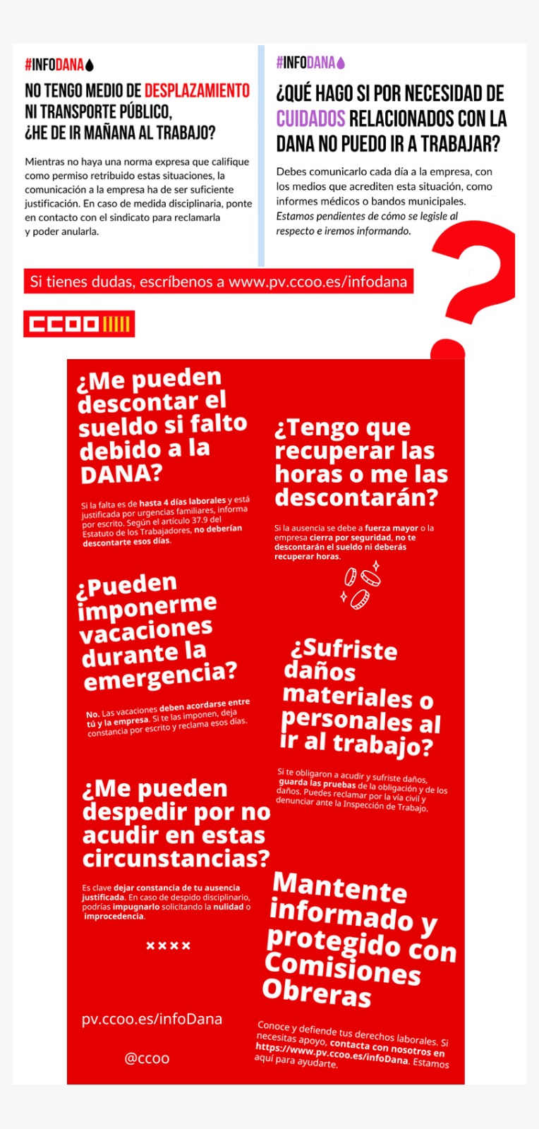 Entre las dramáticas consecuencias (humanas, sociales, económicas) de la dana que ha asolado especialmente a País Valencia, existen también implicaciones laborales que deben abordarse sindicalmente, velando por los derechos y la situación laboral de las personas afectadas, como vamos a procurar hacer desde CCOO Servicios.