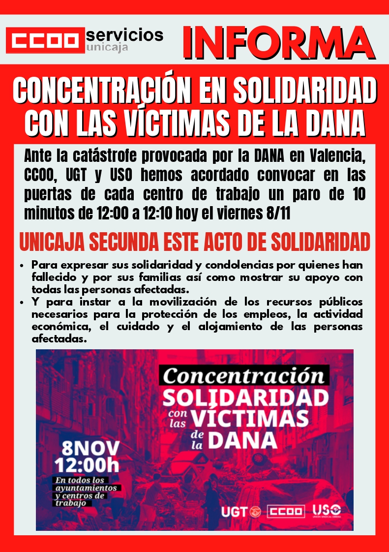 Ante la catástrofe provocada por la DANA en Valencia, CCOO, UGT y USO hemos acordado convocar en las puertas de cada centro de trabajo un paro de 10 minutos de 12:00 a 12:10 hoy el viernes 8/11
