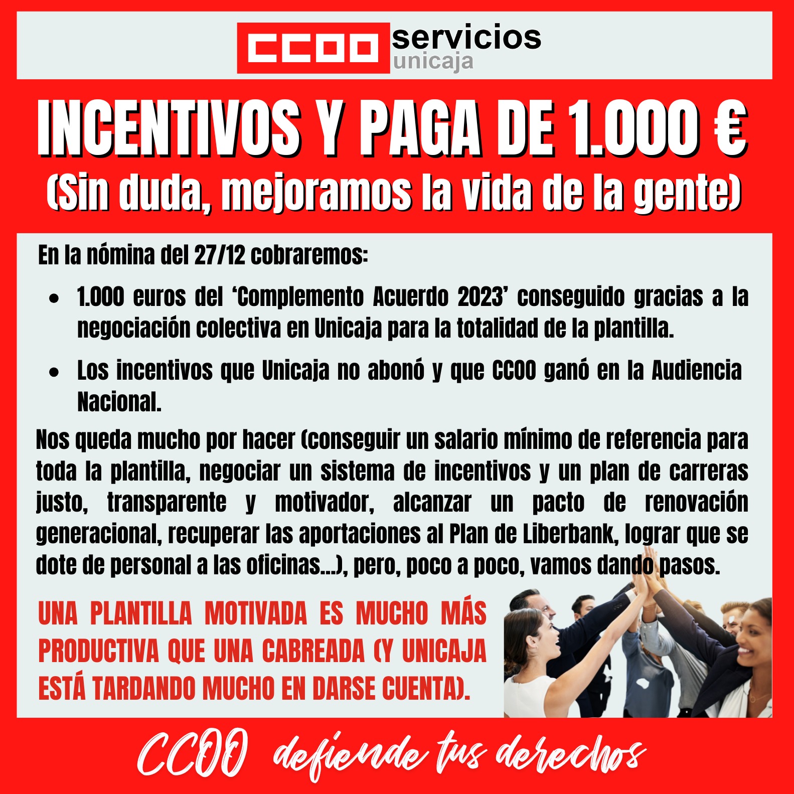 -1000 euros del ‘Complemento Acuerdo 2023’ conseguido gracias a la negociación colectiva en Unicaja para la totalidad de la plantilla